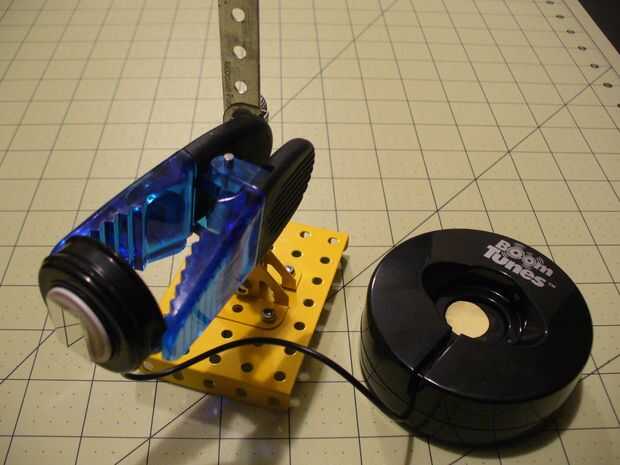 Ahora vamos a tener que colgar el láser y el conferencista sobre el mismo nivel que el espejo de spinning (es más fácil apuntar el láser en el espejo en el altavoz, entonces en el espejo de giro y luego en la pantalla de papel milimetrado). Usé Erector sets piezas para construir soportes para el láser y el altavoz.