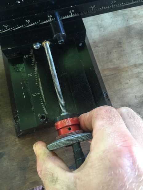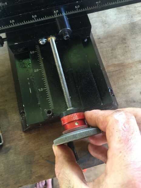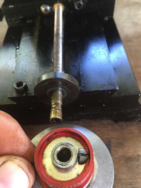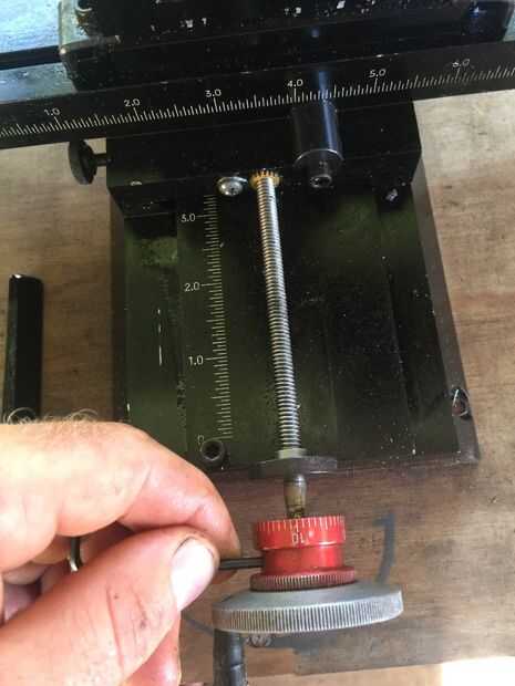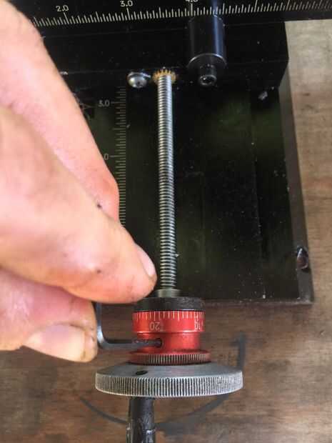 Aquí vamos a encontrar el agujero oculto en la base de la rueda de mano, bajo el ajuste de cero tubo rojo micrómetro. Gire la parte roja por separado de la rueda más grande hasta que vea el orificio aparece debajo del tubo de indicador de rojo de micrómetro. Aquí es un tornillo que aflojar para deslizar la rueda toda la mano el husillo.