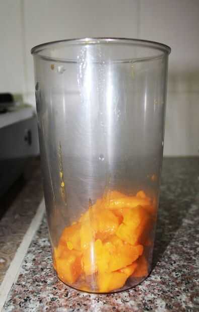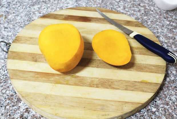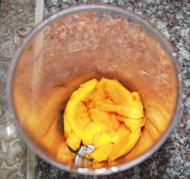 Corte una rebanada de mango n mantenerlo aparte para decorar. Quitar la piel de lo restantes n de mango cortado en trozos y añadir en el Bol.