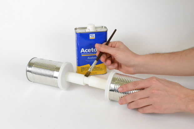 El mango de la pesa de gimnasia ya prensado, pero usted puede combinar las dos piezas con un poco de acetona. Cal de acetona también quitar la textura de la impresión 3D, pero yo personalmente prefiero el papel de lija para esa tarea.