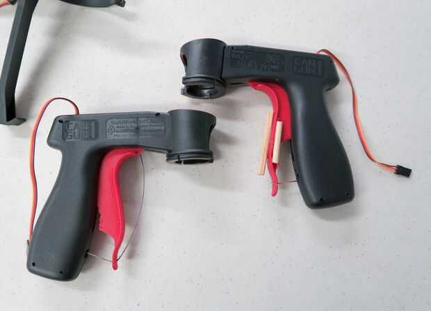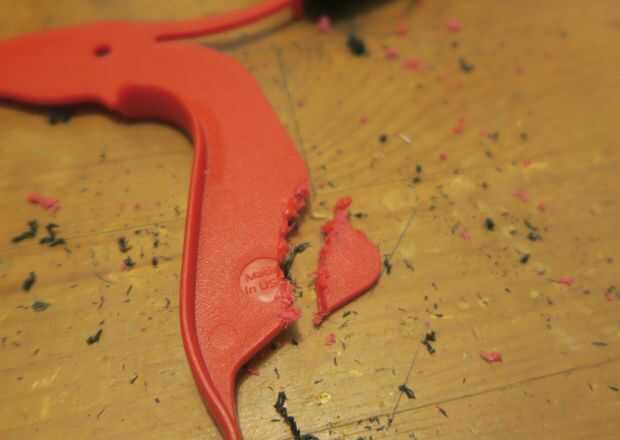 Cuando prototipos, siempre es útil tener dos de cada parte en caso de que uno se rompe o necesita solucionar problemas! La poder del arma a la derecha sufrió una rotura pequeña corte el gatillo rojo, que estaba fijado con trozos de palillos y cola abundante. Aprender de nuestro error y recortar sólo una pequeña cantidad del mecanismo de gatillo rojo.