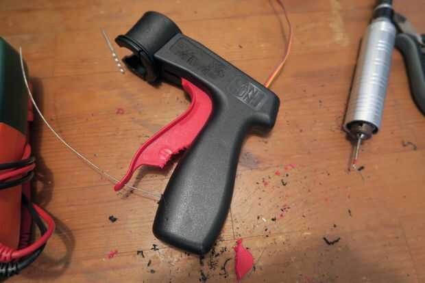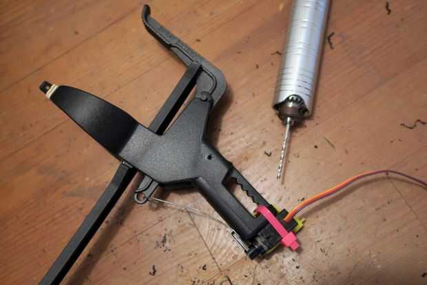 Conecte un cable a la bocina del motor y funcionamiento a través del orificio en el gatillo. También es útil para la ruta hacia fuera un poco de holgura en el mango para el cable mover.
