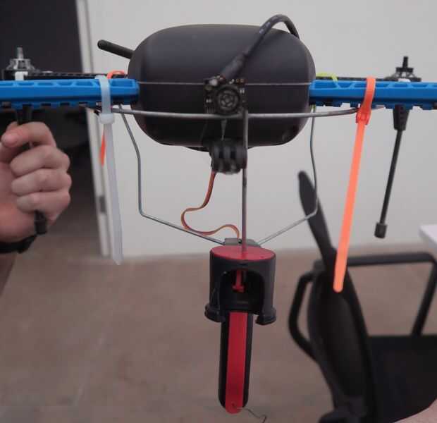 Pruebe la colocación de su micro servo en un lugar donde el movimiento puede tirar la lata gatillo. Fijar con pegamento E6000 o epoxi y dejar para secar (quadcopter pie utilizándose en foto de arriba como un espaciador sólo mientras el pegamento seca).