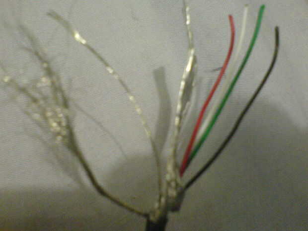 3. a continuación encontrará 6 cables, uno braded que envuelve a todos alrededor del cable, otra plata que es con el braded uno. A continuación, detrás de una película de papel de plata, otros 4 cables, negro rojo verde y blanco.