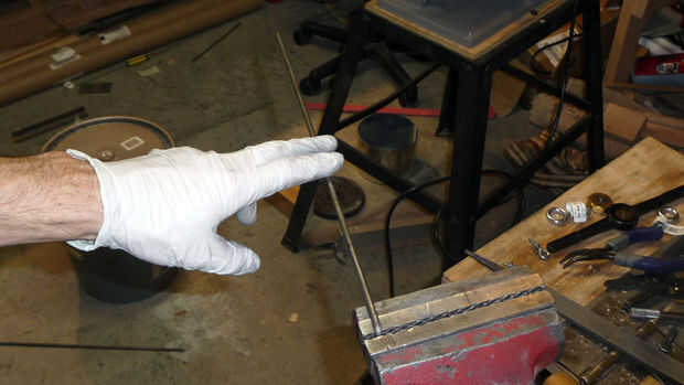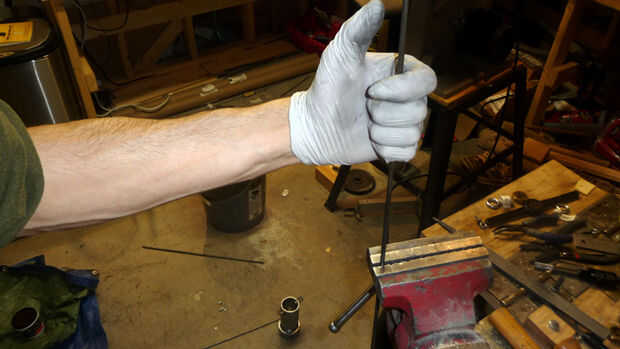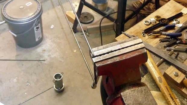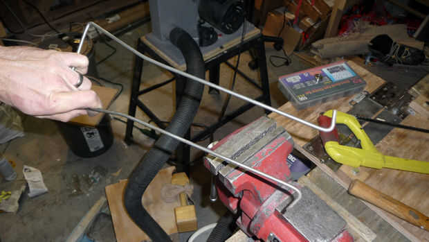 Primero tome un pedazo de 3/16" varilla de acero que es 3' de largo. Marque dos puntos 16" desde cada extremo. Abrazadera de la varilla en un tornillo en cada marca y doblar la varilla que terminan con forma de U.