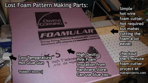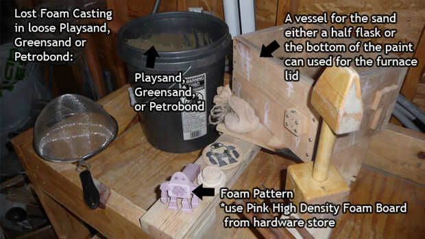 Con espuma perdida casting te puede echar piezas mucho más complicados que el método de colado tradicional, ya que no tiene que preocuparse por eliminar el patrón del molde. Por lo menos debería poder comenzar casting con sólo arena de juego, un recipiente para contener la arena y un patrón de espuma. Los resultados pueden no ser perfecta, pero estoy recomendando partiendo simplemente del bastidor perdido de la espuma ya que será la forma más rápida para emitir una parte potencialmente interesante / complejo sin necesidad de hacer todas las herramientas de moldeo.