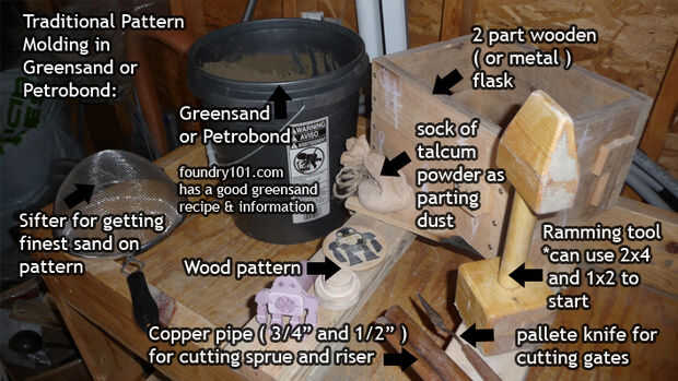 ¿Qué es arena verde? Es simplemente una mezcla de bentonita sur, arena fina y agua. Hay tanta información en el foundry101.com que no entrar en ella más y simplemente se recomienda revisar su sitio web, o compra de Dave Gingery libro #1 (horno de carbón) para sus recomendaciones. Petrobond es un producto comercial que se enlaza con aceite en lugar de agua (aunque hay algunas recetas de homebrew flotando alrededor de la red).