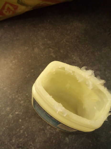 I donó las tres latas de regulares a miembros de la familia Labios fisurados y vaciar la jalea de petróleo, todos los 400g de él en un recipiente de Pyrex y microondas por aproximadamente cinco minutos