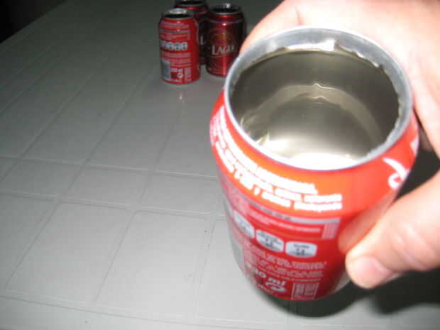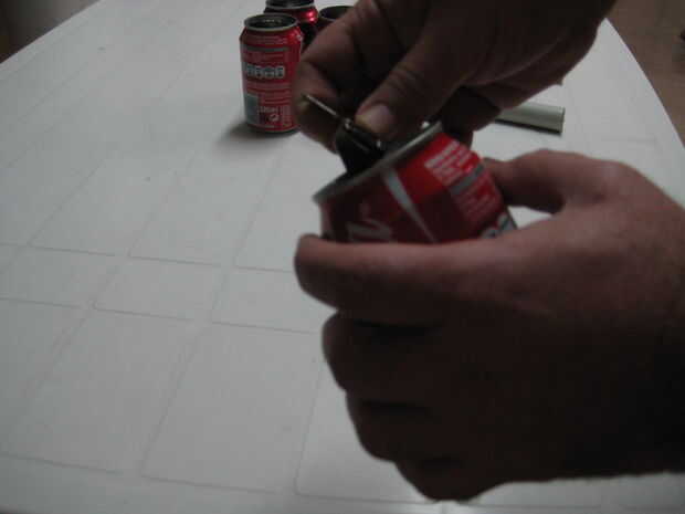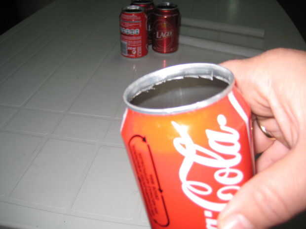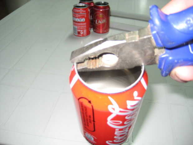 Con un abrelatas, quitamos la parte de la lata donde está la anilla. Alisamos los bordes con unos alicates universales. No es necesario esmerarse mucho ya quedarán tapados por el mortero. y no es peligroso.