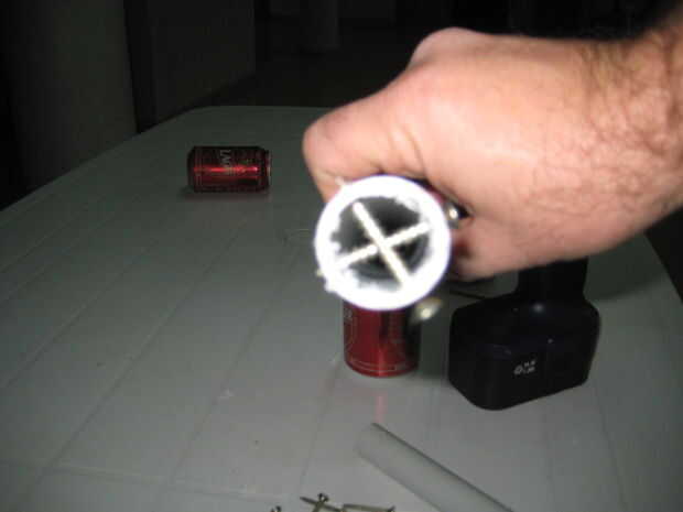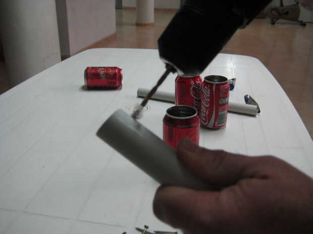 Hacemos unos agujeros en los extremos del tubo y pasamos unos tornillos o clavos formando una cruz. El objetivo es que, al secar el mortero la unión con el tubo o madera, mar fuerte y no se línea con el uso.