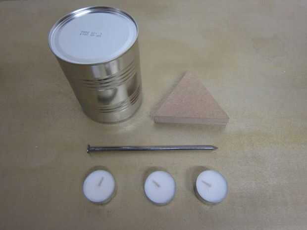 -Una placa base capaz de transportar tres velas de theelight. Usé un triángulo de OSB con lados de 10cm. Podrá hacer agujero, ajuste firmemente el clavo o barra. Casting el clavo en una base de yeso puede ser una buena alternativa, ya que completamente no inflamable.
