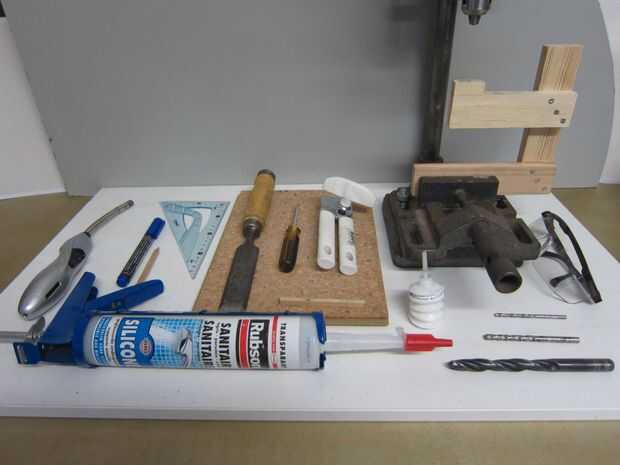 -Algunos de desecho de madera y tornillos para hacer un soporte de perforación.