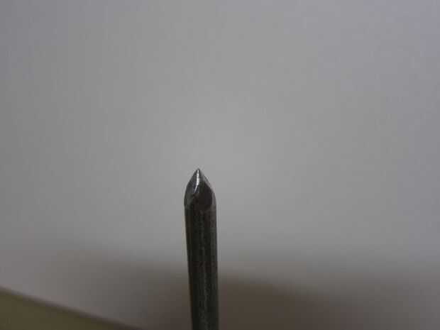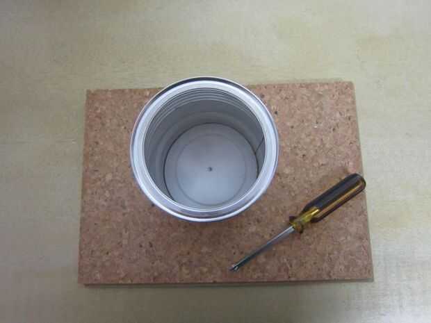 El cojinete consiste de un hoyuelo en la parte inferior, hecha desde el interior, colgando en el punto afilado de la uña o barra. Para colocar bien el hoyuelo en el centro he utilizado una plantilla de corte de la tapa de plástico con que del poder vino. La depresión se hace con un destornillador Phillips, empujando y girando. No exagero, como no va a funcionar si usted perforar el metal. Basta con un hoyuelo sólo lo suficientemente grande como para mantener las cosas en su lugar en el clavo.