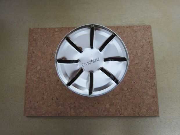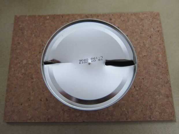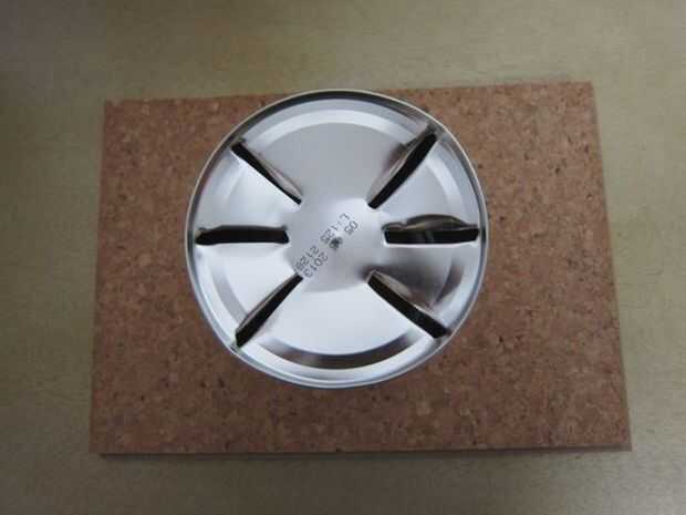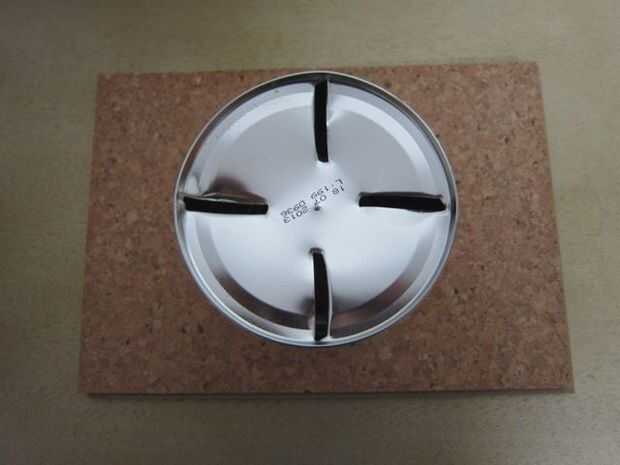 El corte hecho por el cincel no es simétrico. Un lado claramente está doblado hacia abajo. Esto no es problema, como vamos a utilizar esto en la configuración de las paletas, pero usted debe tener este efecto siempre al mismo lado, es decir, ya sea siempre en el sentido horario o antihorario siempre (ver imagen 6 más abajo). Un truco que ayuda a no girar el cincel, sino moviendo la lata debajo de él. Para estos cortes, el cincel no se inclina. Es una buena idea hacer los cortes en el orden indicado, para limitar la deformación.
