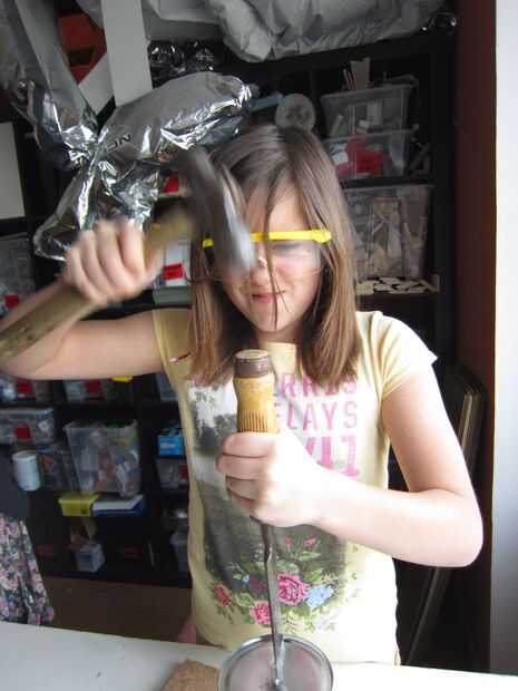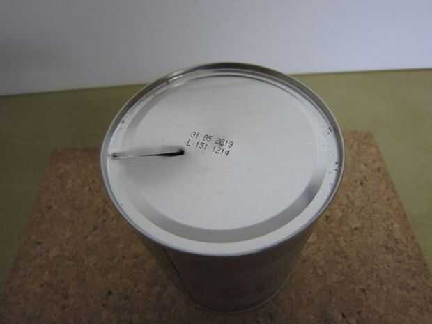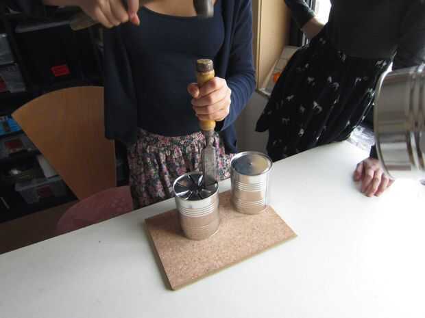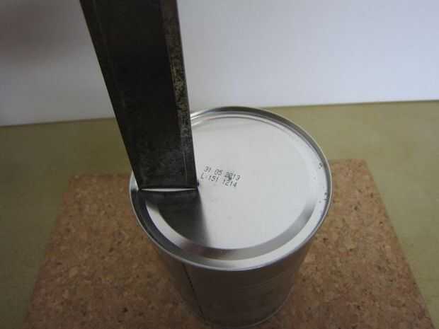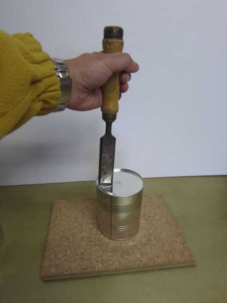 hice cortes en la parte inferior, cerca del borde, con un cincel de madera vieja, como se muestra. El primer corte fue el más complicado. Después de la primera de ellas, parece ser una relajación de las restricciones y es más fácil hacer un corte limpio. Para el primero de ellos que necesitaba evitar el corte iniciado en el borde, porque el borde comenzó a deformar. Cuando cuidadosamente inclinando el cincel para comenzar el corte cerca del centro, la deformación es limitada. Una vez que se inicia el corte, proceder con el cincel vertical otra vez, o usted podría terminar cortando el lado de la lata.