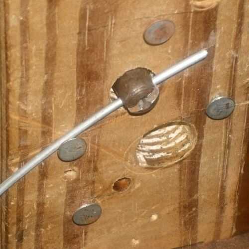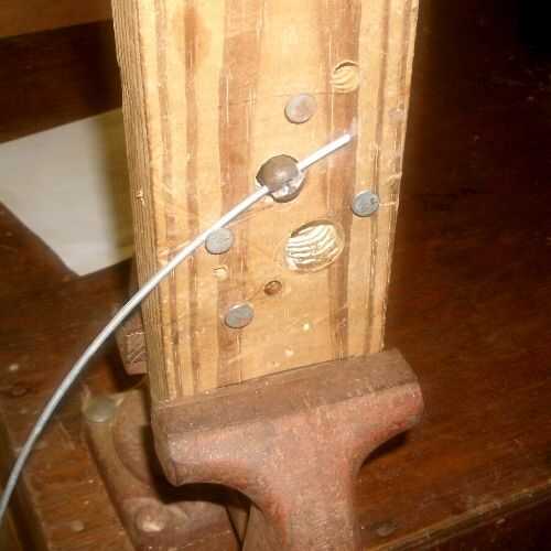 Mi sistema para enrollar muelles helicoidales es bastante simple. El alambre se envuelve alrededor de una varilla, tubería o mandril cónico (mi favorito porque los resortes pop más fácil cuando se hace). Usar varilla de 1/4 de pulgada para mis resortes de diámetro más pequeño. La barra pasa a través de un agujero en una pieza de 2 X 4 en un tornillo de banco. La punta de la varilla o tubo tiene un canal cortado en lo que quede la punta del alambre para iniciar la liquidación. Una tachuela cubierta cerca del agujero es una guía para el cable.
