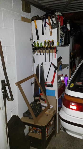 el garaje y un mini banco y estante como yo comparten el garaje.