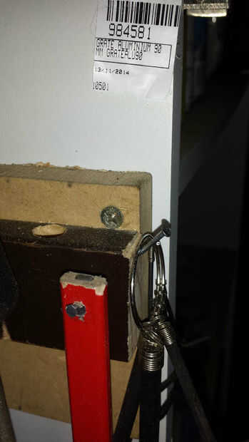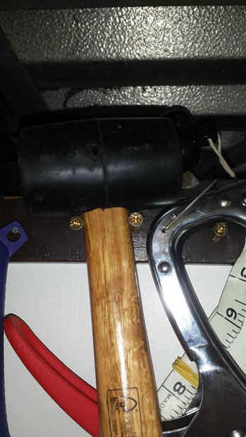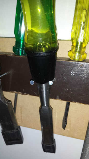 Agujeros en un pequeño trozo de madera que atornillado a la pieza principal de madera también perforados. Esto fue utilizada para destornilladores en sobre todo.