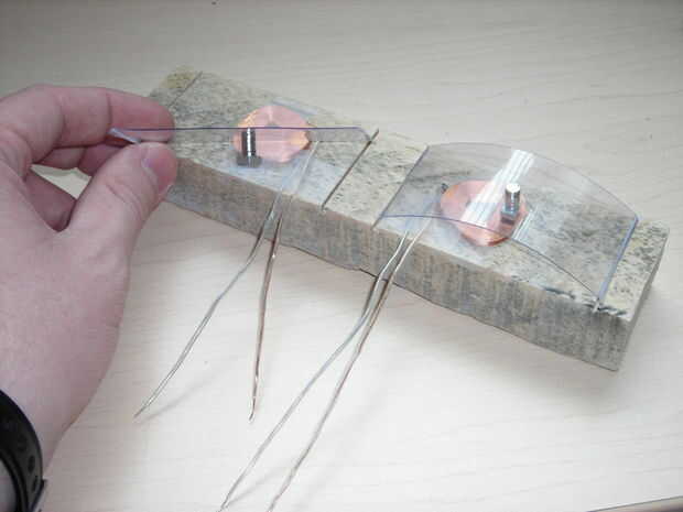A continuación coloque los extremos en la hoja de plástico en las ranuras correspondientes en la base del altavoz, como se muestra en la imagen.