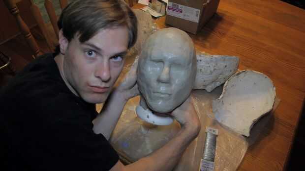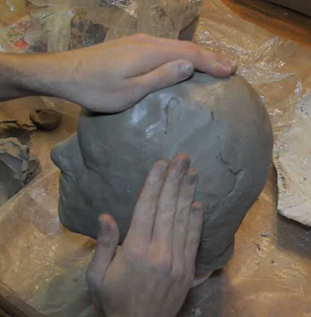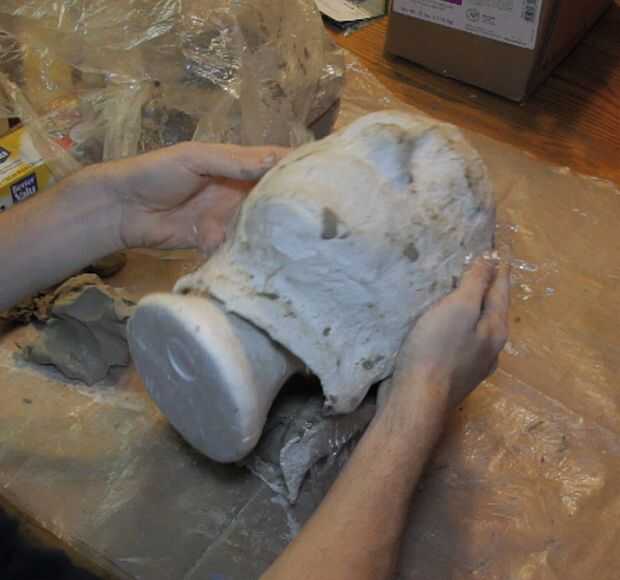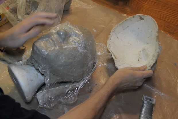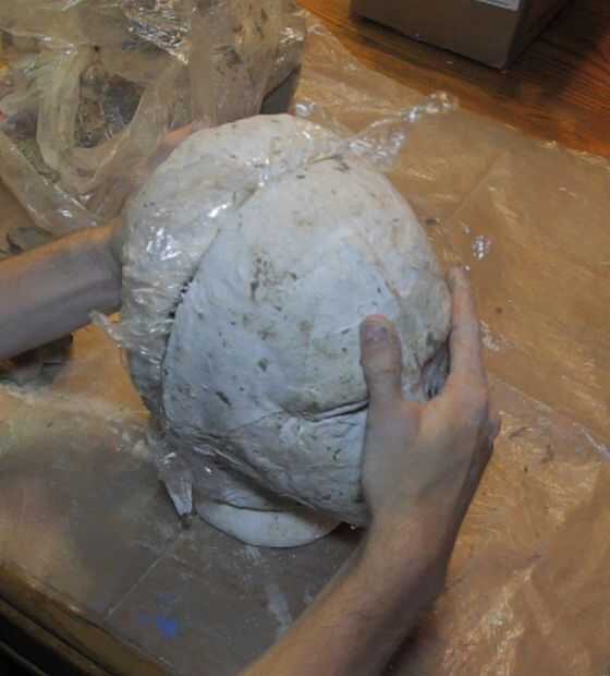 Una vez la arcilla en los moldes, y presiona firmemente contra la cabeza de espuma, se pueden entonces lograr los moldes de yeso. La envoltura de plástico se adherirá a la arcilla; Pele. Agregue más arcilla para llenar la costura donde se reúnen las dos mitades, y lisa todo hacia fuera y usted debe entonces tener una copia de la arcilla de la cabeza, lista para esculpir!