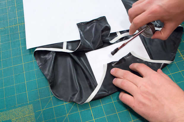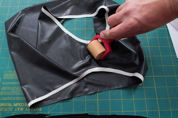 2. Asegurar ese frente y posterior línea para arriba perfectamente. Usted puede estirar el material ligeramente si es necesario como está pegando.