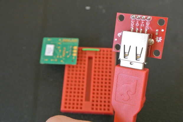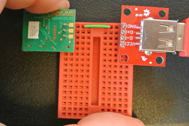 A continuación, realizará entonces su breakout Junta (conectado al USB rojo) y montarlo en el protoboard como se muestra a continuación. Asegúrese que el receptor Polar GRD está justo enfrente GRD de la placa breakout.