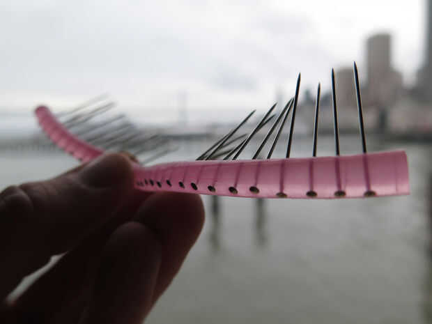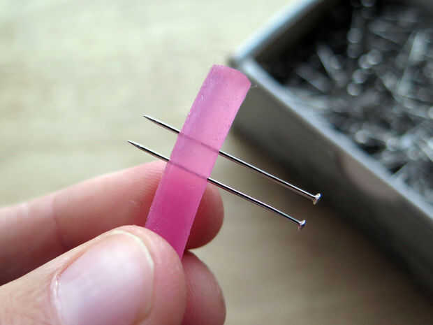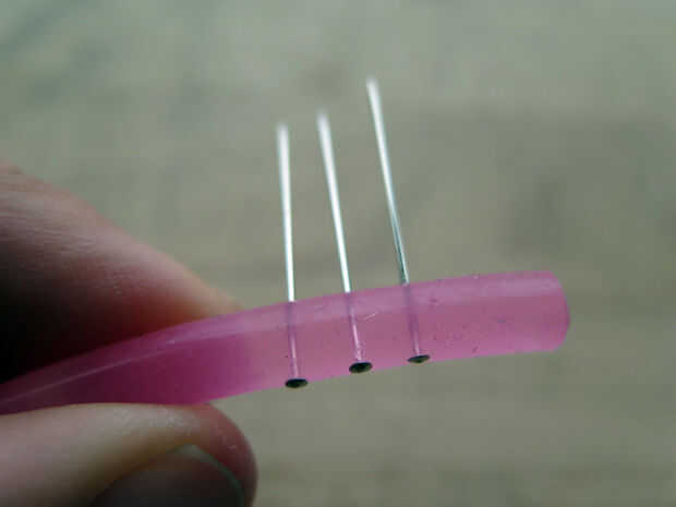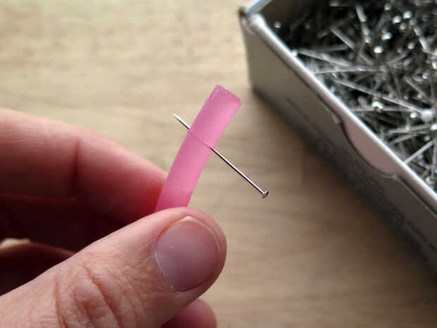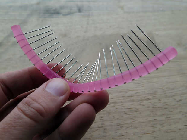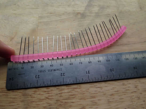 Para crear las pestañas pin en silicona, introduzca uno por uno. Asegúrese de que tengan un espaciado uniforme, paralelo e ir a través del centro del tubo. He utilizado 28 pines a lo largo de 13,5 cm de tubo de silicona.