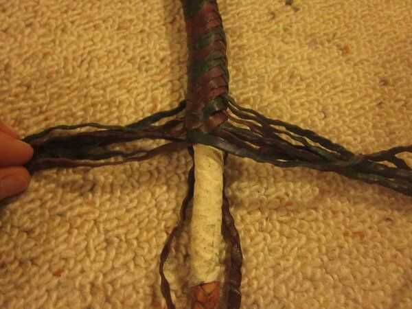 Continuar trenzado para cerca de 1/5 de la longitud del látigo, y dos filamentos de la gota. Caer mechones por separar las dos cadenas más cortas y al llegar a posiciones L4 y R4, los ponen junto al vientre y la trenza sobre ellos. Ya entonces se tienen dos filamentos menos que antes, cambio su patrón trenzado para menores de 4, 3 y continuar trenzado. Una vez que han trenzado sobre aproximadamente 2" de los filamentos caídos, cortado en diferentes longitudes y continuar trenzado.