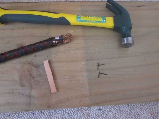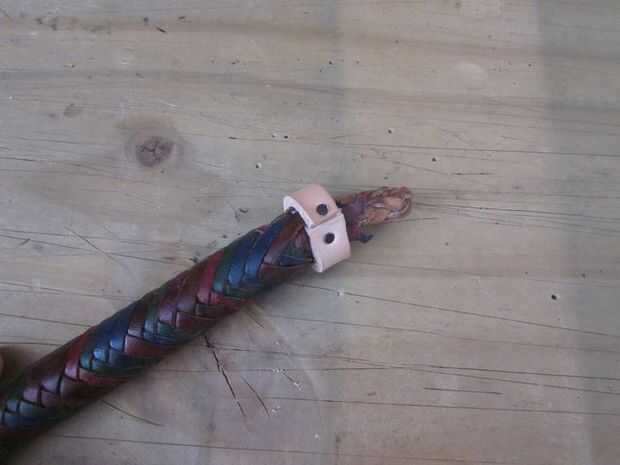 Corte una tira de cuero grueso o de goma de 1/4" y el tiempo suficiente para ir alrededor de la empuñadura de su látigo. Uso alfombras bordadas para clavar alrededor de la manija, cubriendo los azotes que mantiene los filamentos.