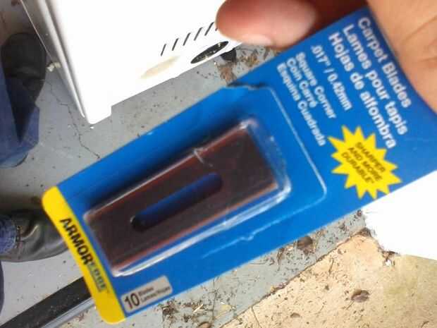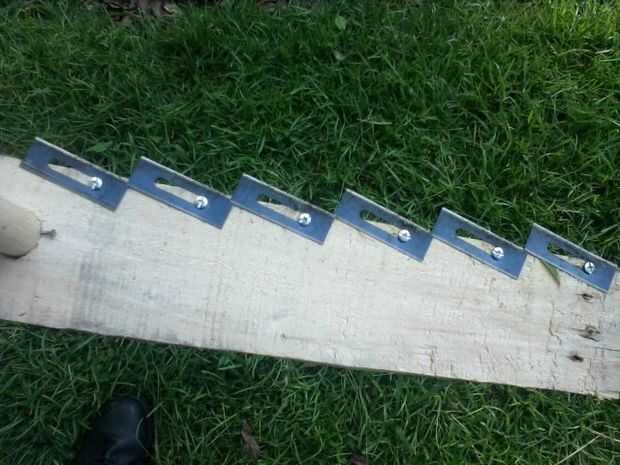 Para el lado para cortar el látigo de la hierba, tomé algunas cuchillas de repuesto para un cuchillo de la alfombra y atornilladas a la tabla, dejando unos 3/4 - 1inch sobresale. Estas cuchillas son fácilmente disponible, barato, muy fuerte y tienen la ranura perfecta por el medio en donde se inserta el tornillo. He dejado un poco de menos espacio que la longitud de las hojas entre cada tornillo. Quería recrear el ángulo de corte eficaz que las estriaciones ofrece