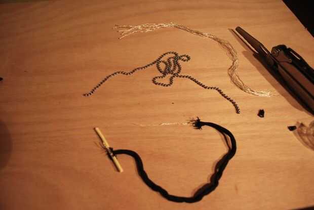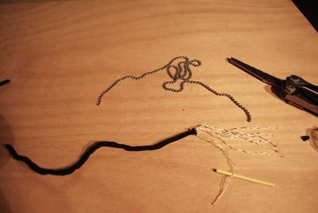 Hacer una aguja de alambre para tirar de la cadena a través de la cadena, roscado a mano cm por cm, enhebrar un alambre de todo a través de él primero y tirando atrás con la cadena pegada a él...