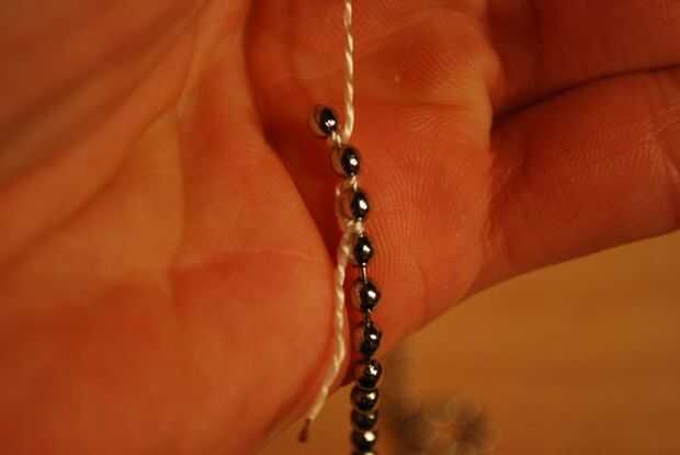 Luego atar un extremo de las bolas de hilo interior 1-3 pasados lejos el final de la cadena de la lámpara utilizando el nudo más pequeño posible. (anterior con medios nudos entre cada bola puede ayudar a mejorar la tolerancia de tracción longitudinal como nudos atados en los filamentos interiores mancha tienden a ser un poco resbaladizo)