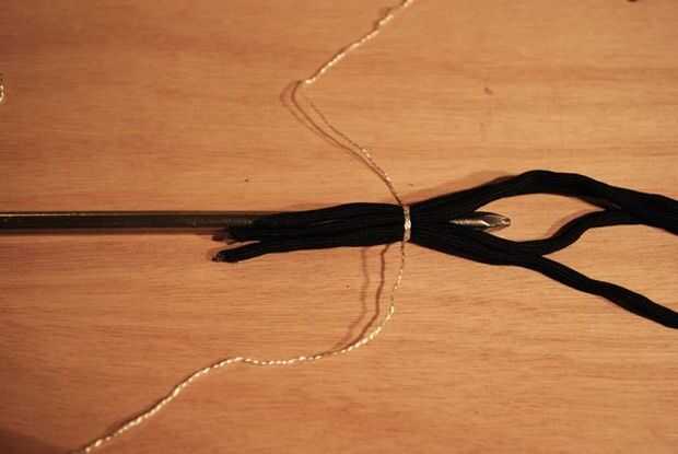 Fijarlos donde el surco es usando un nudo constrictor (o dos) y usando uno de los filamentos del interiores sólo saca ouf las cuerdas.