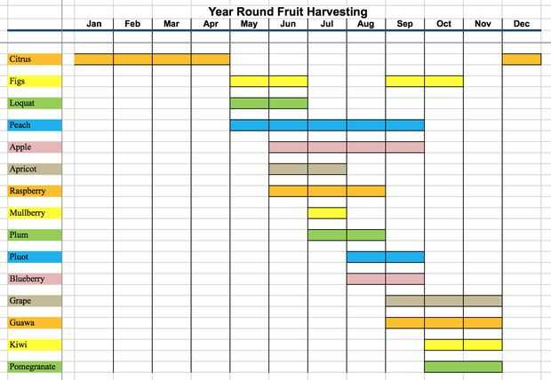 La hoja de cálculo adjunta muestra las distintas variedades he podido injerto de mis árboles frutales sobre los años, y la imagen muestra cómo soy capaz de cosechar los frutos durante todo el año por tener una gran variedad de frutas y extender la temporada de crecimiento de cada tipo de fruta.