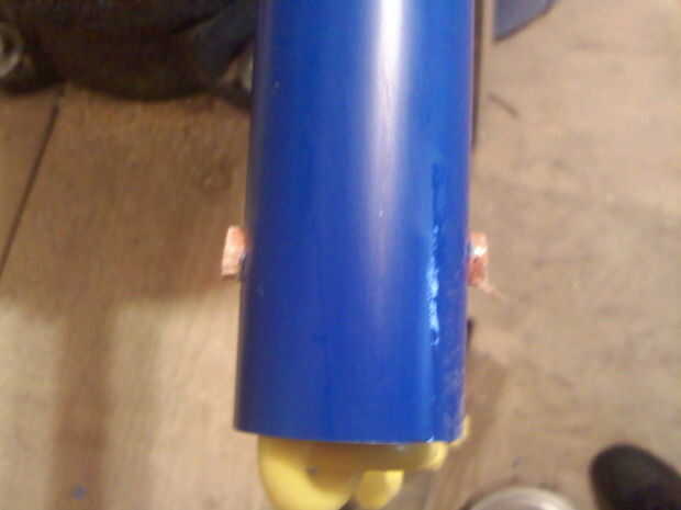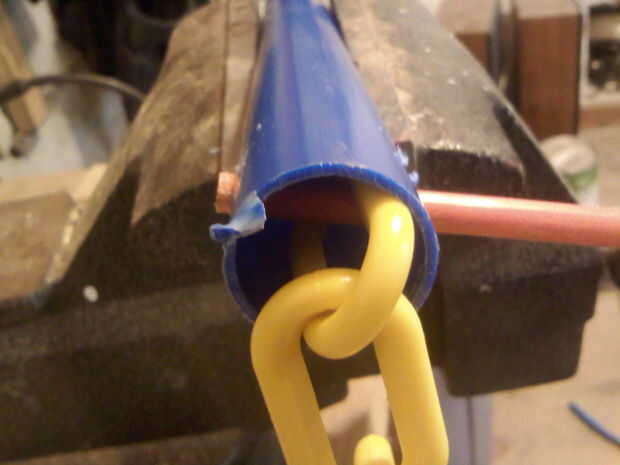 Una vez que han perforado un agujero de un lado a otro toma el último eslabón de su cadena de plástico de 3 pies y ponerlo en el tubo de pvc. después de eso, girar y empujar la pieza de varilla fibra vidrio a través del orificio, a través del enlace de 1 cadena y también el otro lado de la tubería de pvc. (Nota: puede que necesite una goma martillo a golpea el pedazo de varilla fibra vidrio un par de conseguir también el otro lado)