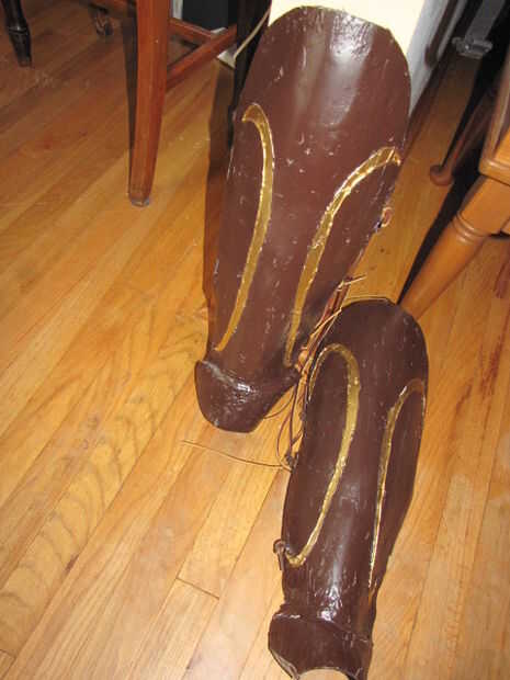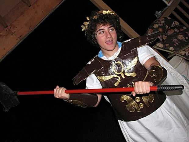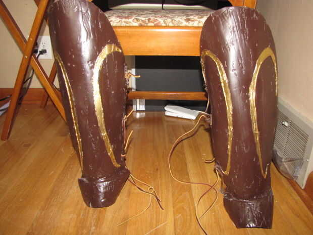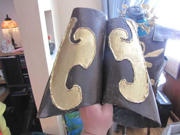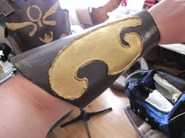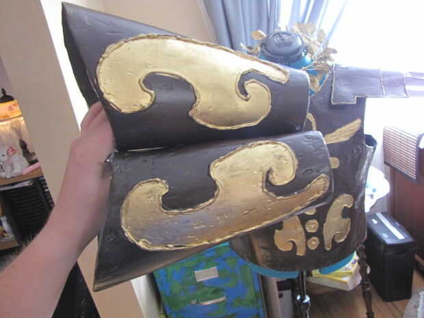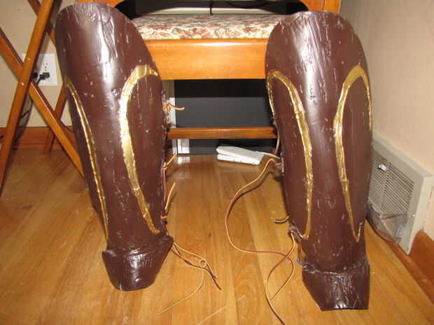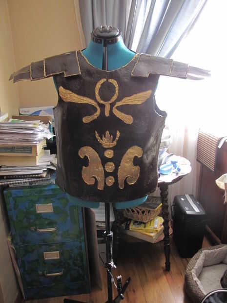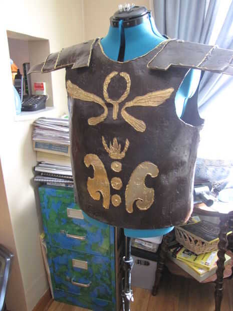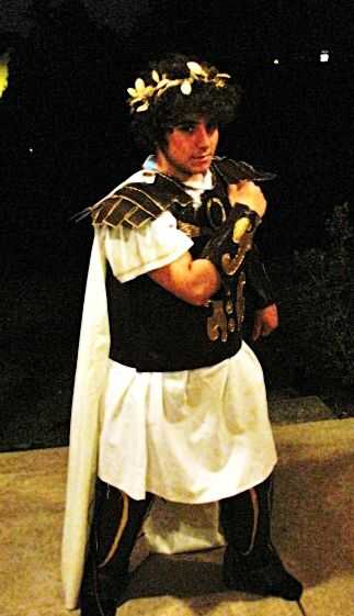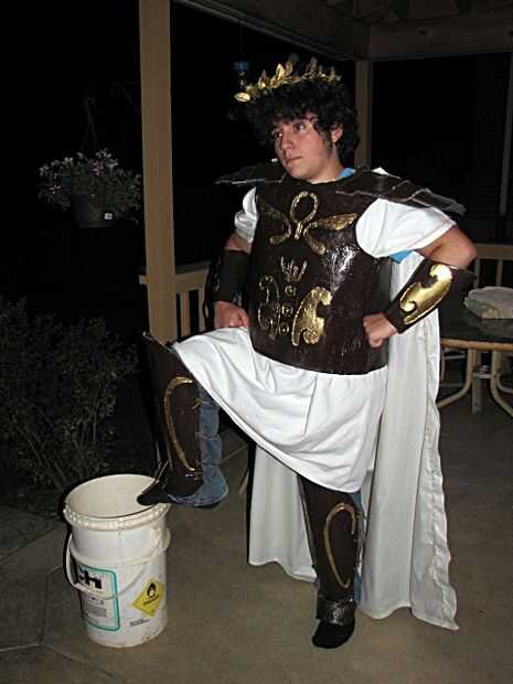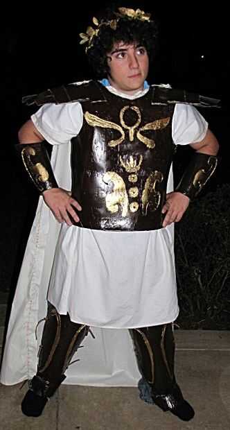Es cierto que está un poco descuidado. Se realizó en las 3 semanas entre baile y fecha de vencimiento del proyecto y la armadura se hace de espuma de embarcaciones, fibra de vidrio y bondo. Entonces fue dado una capa de imprimación, luego marrón pintura en aerosol y luego la pintura oro. La corona de laurel es caliente plástico hojas pegadas y aerosol pintado de oro. El cabo es simplemente un cuadrado de tela blanca y la túnica es de patrón de traje de Halloween de dioses romanos de un adulto que parece que no puedo encontrar.
