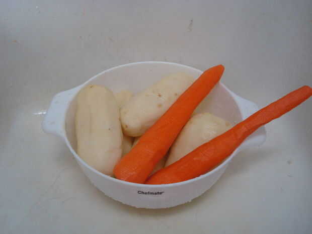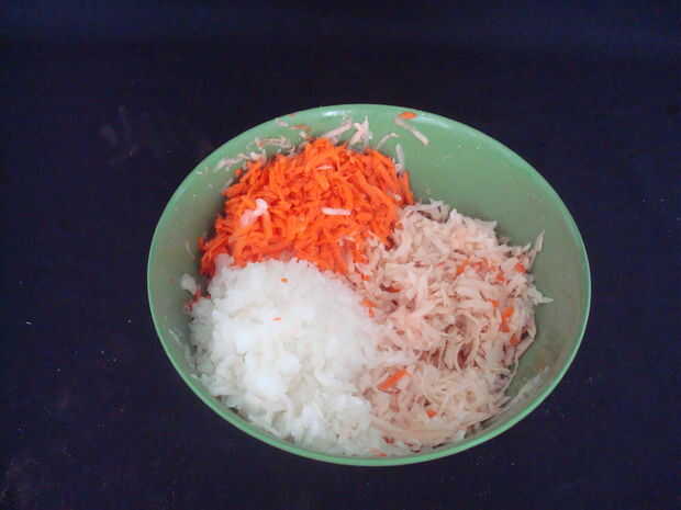 Lavar, pelar y rallar las papas, la cebolla y la zanahoria.  Poner verduras rallados en un bol grande y mezclar.