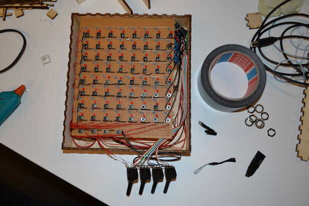 Sándwich la electrónica entre el soporte y los botones, conectar todos los cables a tu arduino y conectarlo a su ordenador. Cargar el firmware en el arduino y ejecutar el software de procesamiento. Entonces iniciar un programa de música capaz de reproducir MIDI, ahora debe ser capaz de usar el secuenciador.