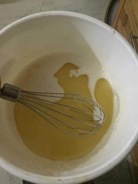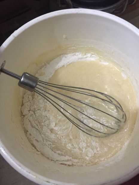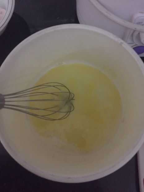 Mezclar el huevo y el azúcar hasta incorporar. Añadir el aceite y mezclar bien. Tamizar la harina y el polvo de hornear juntos. Añadir. Añadir la vainilla.