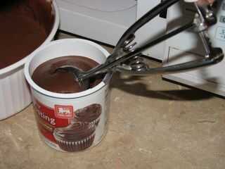 Usando una cuchara de helado, (como nuestro impresionante pala mediano) sacar la mitad del glaseado de la lata y plop en el centro de la masa de la torta. .