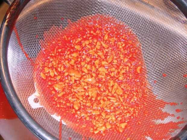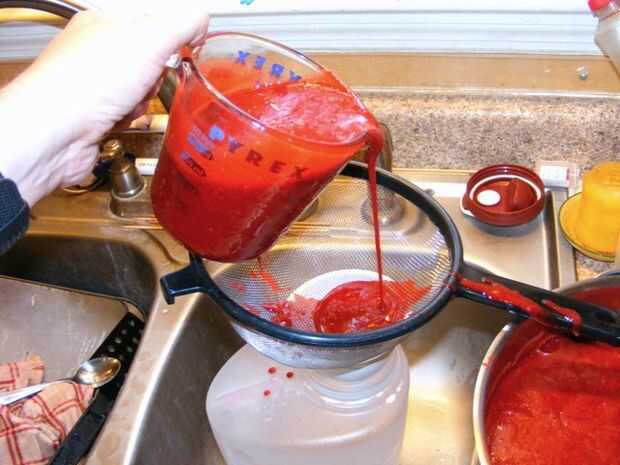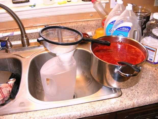 Cuando se ha llegado a un color de sangre te gusta, filtrar la sangre en un recipiente de un galón para el almacenaje, con un colador de malla ancha o estopilla para quitar los trozos de disuelta la mantequilla de maní. La mezcla es muy espesa, entonces colar pequeñas cantidades a la vez. Usted probablemente tendrá que parar sobre a medio camino a través de limpiar el filtro o reemplazar la estopilla.