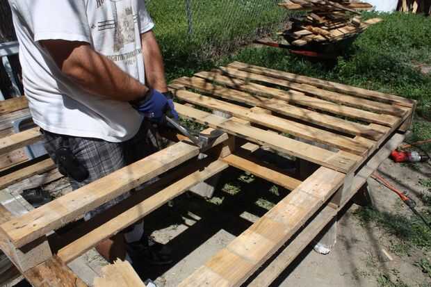 Palets usados, tornillos (diferentes tamaños), palanca, martillo, pistola, Sierra, caladora, Sierra, lijadora, sellador de ingletes y diluyente de pintura.