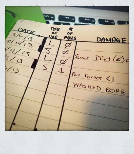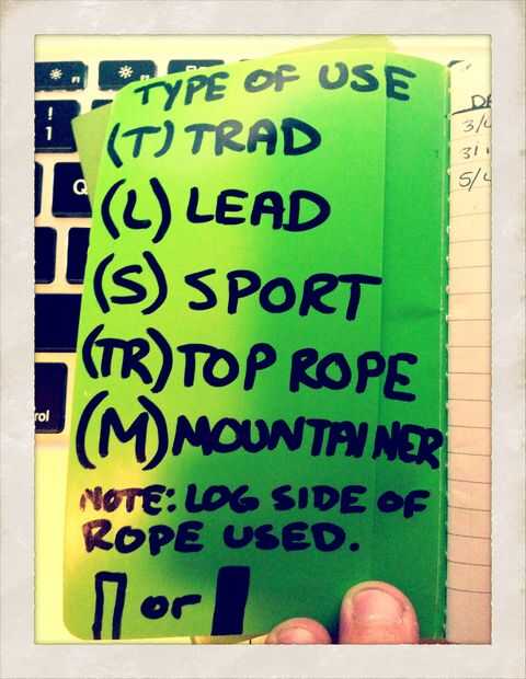 El registro de la cuerda es otra herramienta fundamental para el responsable de la escalada. Es una manera eficaz de asegurarse de que están alternando extremos para poner uniformemente al usar largas sogas (60 m +), registro de caídas y sus respectivos factores (cuerdas están clasificadas sólo para un promedio de 7-9 caídas con factores de 1.5-2. Consulte su sitio web fabricante de cuerdas para ver lo tuyo es) y registrar si la cuerda era pulido con abrasivos aristas de roca o entró en contacto con cualquier líquido desconocido, y finalmente la cuerda cuántos años tiene y cuando la última vez que lo lavaron.