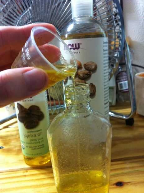 Esta parte es súper fácil! Usar partes iguales de Jojoba y aceite de ricino y unas cuantas gotas de aceite de árbol de té. Aceite de argán se puede utilizar en lugar de jojoba pero es un poco más caro. Este es el agente de ablandamiento/limpieza de la piel. El aceite de ricino es sacar la suciedad. Si no eres propensa a manchas se puede reducir la cantidad en la mezcla. El aceite de árbol de té es el elemento anit-hongos y la cantidad también se puede ajustar para adaptarse a la piel.