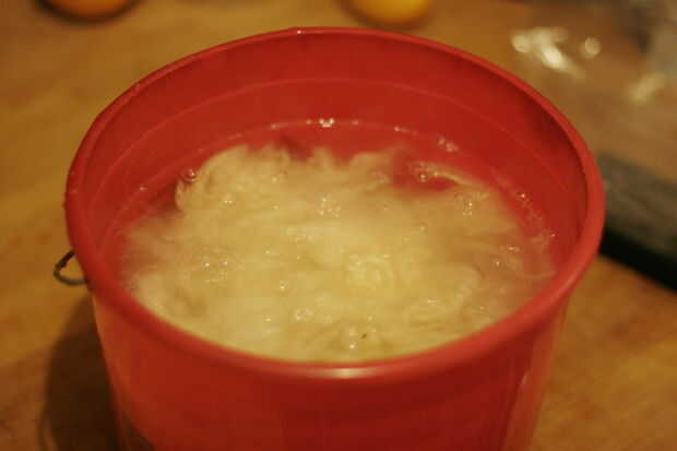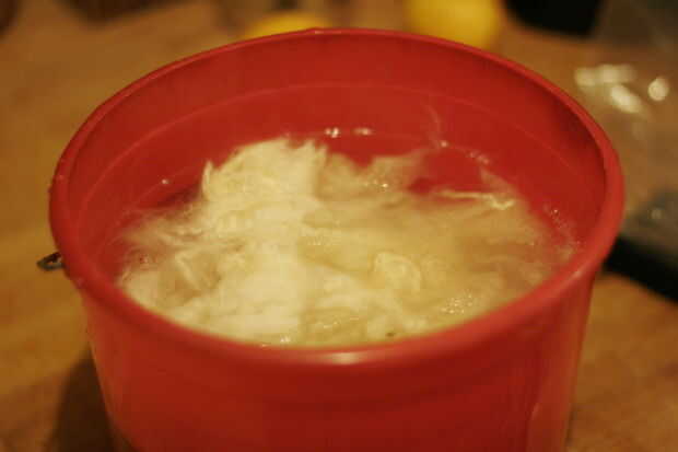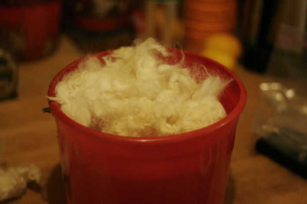 Ahora su lana y ajústelo suavemente encima del agua. Debe hundirse un poco en su propio. Dejarlo hacer eso y poco a poco añadir más hasta que haya sólo unas pocas pulgadas de agua en la parte superior. Desea dar la grasa en algún lugar para ir y ser capaces de volcar el agua con la grasa flotando en él para que no asiente a la fibra.