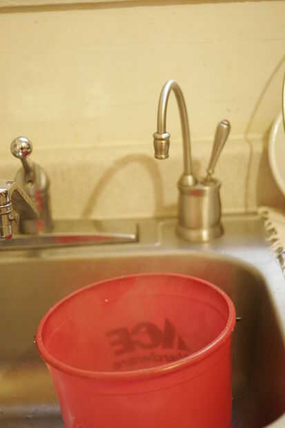 Llenar el cubo de la mayor parte de lo completo con agua caliente. Muy caliente en este caso debe ser un poco demasiado caliente poner las manos en el. Utilicé agua de nuestro grifo de agua caliente instantánea que se encuentra en sobre 190F. No estoy seguro cuál sería el mínimo pero que funciona bien para mí.