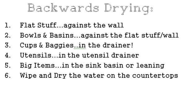 1. luchar contra las ganas de poner todos los elementos planos que enjuagarse primero en el escurridor. En su lugar, colocar toallas en la encimera y poner allí todos los platos, tazones, etc. (asegurándose de que éstos son todos verticales con entre espacios que para que hacer un montón de flujo de aire en su interior). Primero pone sus placas contra la pared vertical. Entonces, úsalo como base para sus otros platos contra se inclinan a mantener todo vertical, también. ¿Hace sentir bien? Más cosas en primer lugar, luego más voluminosos cosas a seguir. (Punta: al poner sus artículos de primera planas contra la pared, usted puede convertirlos hacia adentro la espalda contra la pared y los frentes están frente a usted. De esta manera la parte comes en todavía no contaminada por cualquier cosa en la pared tienes aún para limpiar apagado. Esto no es necesario y yo aun no hago todo el tiempo, pero es algo que, una vez más, considerar).