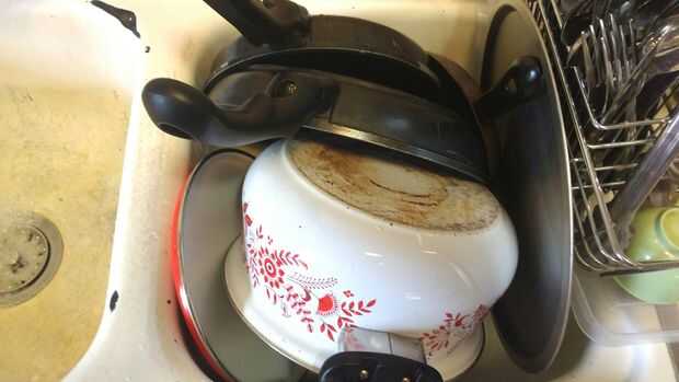 3. al llegar al último paso de enjuague y secado su grande, si usted ha estado siguiendo mi enfoque y poner todos sus platos en las toallas o en el escurridor, ahora tienes gratis dos cuencas (o un lavabo libre, si un solo fregadero) para almacenar sus artículos grandes para secar. Siempre ha sido tan engorroso a éstos poner a secar al aire, pero ahora... tan simple como es, este pequeño truco totalmente final de vuelta del ganador! Simplemente empezar con tus sartenes por lavado y apoyado contra la pared del fregadero vertical. Luego añadir cualquier tapas de olla que no puede han aclarado con el plano material. Luego añadir tus macetas. Y, finalmente, sus hojas para hornear. A veces para mantener lo vertical (y no deslizarse) necesita poner una olla en primera así las asas de la olla ir por el desagüe del fregadero y actúan como un refuerzo para los otros elementos. Puedes ver que lo hice con el bote rojo y blanco en la imagen de arriba. Tienes que hacer es solo que hagan whatchya! ;) Si te quedas sin espacio cuenca, capa de artículos grandes como sus hojas para hornear detrás de los elementos de placas plana contra la pared, o macetas lean back que no ponen planas o boca-abajo en las toallas. No es malo... Estos son solo consejos!