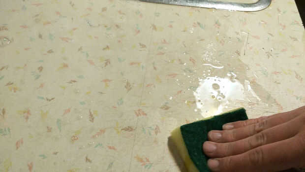 4. las encimeras se mojada y enjabonada después que has hecho a este enfoque. No se asuste, jajaja. Simplemente tome la esponja, apriételo hacia fuera y limpiar este exceso de agua en el fregadero (incluso encima de las espaldas de ollas y sartenes). Luego use una toalla de mano y secan la humedad restante. Este paso guarda su laminado (y aun bloque de carnicero) contadores de combeo o burbujeo en el futuro.