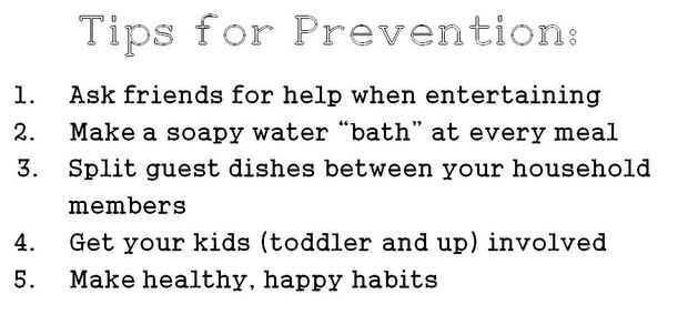 Cuando la comida, cada uno hace un lavado rápido de sus propios platos (plato o bol, utensilios, taza). Cuando entretenido, o bien puede hacer que tus invitados hacer esto también, o puede dividir platos de sus invitados entre cada persona de su hogar. Por ejemplo, si usted tiene una familia de cuatro, y tiene cuatro clientes que visitan, cada miembro del hogar puede tomar set de uno de los invitados de platos (con propios) para lavar. Esto mantiene platos de conseguir material endurecido en ellos y los tiene siempre listo para la siguiente comida. Sugerencia: hacer esto, demasiado, sólo en su propio hogar en todas las comidas. Hacer un hábito. :)
